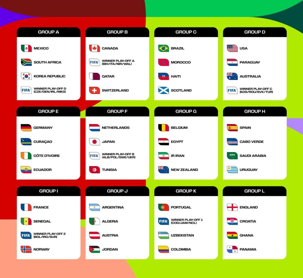 Estados Unidos (Anfitriona), México (Anfitriona), Canadá (Anfitriona), Inglaterra (UEFA), Francia (UEFA), Croacia (UEFA),Portugal (UEFA), Noruega (UEFA), Alemania (UEFA), Países Bajos (UEFA), España (UEFA), Bélgica (UEFA), Suiza (UEFA), Austria (UEFA), Escocia (UEFA), Argentina (CONMEBOL), Brasil (CONMEBOL), Ecuador (CONMEBOL), Uruguay (CONMEBOL), Colombia (CONMEBOL), Paraguay (CONMEBOL), Australia (Asia), Irán (Asia), Japón (Asia), Corea del Sur (Asia), Arabia Saudí (Asia), Qatar (Asia), Jordania (Asia), Uzbekistán (Asia), Argelia (África), Túnez (África), Egipto (África), Ghana (África), Marruecos (África), Cabo Verde (África), Costa de Marfil (África), Senegal (África), Sudáfrica (África), Nueva Zelanda (Oceanía), Curaçao (CONCACAF), Panamá (CONCACAF), Haití (CONCACAF).